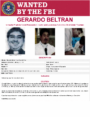 Gerardo Beltran is wanted for alleged lewd and lascivious conduct with four female victims under the age of fourteen during 1991. Beltran held a position as Catholic priest in two Sacramento, California, parishes, which he used to gain the trust of the families of the victims. A local arrest warrant was issued for Beltran on February 10, 1992, by the Sacramento Municipal Court after he was charged with four counts of lewd and lascivious acts with a child under the age of fourteen.