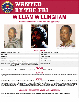 William Willingham is wanted for kidnapping and rape in Tate County, Mississippi. On December 22, 1998, Willingham is alleged to have tied up his girlfriend in her bedroom at her residence, and proceeded to the next room to rape her daughter. Willingham's girlfriend managed to free herself and went to the aid of her daughter. However, Willingham allegedly brandished a knife and forced his girlfriend back into her room. He then returned to the room of his girlfriend's daughter and allegedly continued to rape her. Willingham soon fled the residence. On March 4, 1999, Willingham was indicted by a Tate County, Mississippi Grand Jury for statutory rape and kidnapping. A federal arrest warrant was subsequently issued after Willingham was charged with unlawful flight to avoid prosecution.