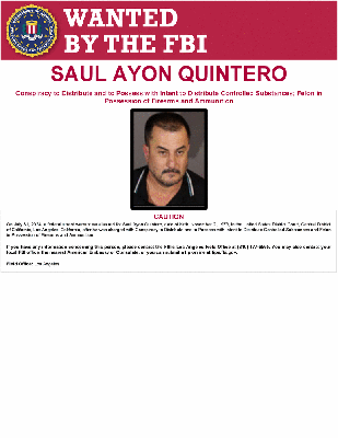 On July 31, 2024, a federal arrest warrant was issued for Saul Ayon Quintero, date of birth, November 2, 1973, in the United States District Court, Central District of California, Los Angeles, California, after he was charged with Conspiracy to Distribute and to Possess with Intent to Distribute Controlled Substances and Felon in Possession of Firearms and Ammunition.