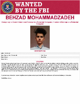Behzad Mohammadzadeh and Marwan Abusrour are wanted for their alleged involvement in criminal activities to include defacing public websites around the world with pro-Iranian and pro-hacker messages. Mohammadzadeh allegedly defaced more than 1100 websites around the world with pro-Iranian and pro-hacker messages, which he began no later than on or about September 4, 2018, and has continued through the present day. He is also alleged to have transmitted computer code to approximately 51 websites hosted in the United States, and defaced those websites by replacing their content with pictures of the late General Soleimani against a background of the Iranian flag, along with the message, “Down with America.” On September 3, 2020, a grand jury in the United States District Court, District of Massachusetts, indicted Mohammadzadeh and Abusrour, and federal arrest warrants were issued for them after they were charged with Conspiracy to Commit Intentional Damage to a Protected Computer and Intentional Damage to a Protected Computer.
