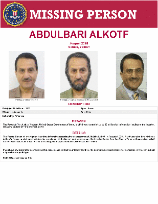 The Federal Bureau of Investigation is seeking information regarding the disappearance of Abdulbari Alkotf. In August of 2018, Alkotf was taken from his home in Sana'a, Yemen, and allegedly detained by armed men. At the time of his disappearance, Alkotf worked for the Sam Ban Noah of America Organization. Alkotf has not been heard from since the time of his disappearance, but he is still believed to be in Yemen.
