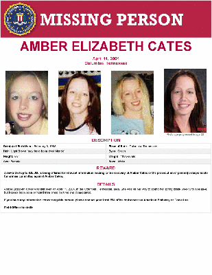 Amber Elizabeth Cates was last seen on April 11, 2004, in the Columbia, Tennessee, area. She was on her way to spend her spring break week with a relative, but has not been seen or heard from since the time she disappeared.