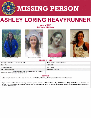 Ashley Loring Heavyrunner was last seen the week of June 13, 2017, in Browning, Montana, on the Blackfeet Indian Reservation.