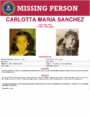On August 30, 1979, Carlotta Maria Sanchez, accompanied by her cousin, Elsie Eldora Luscier, disappeared from Taholah, Washington, which is in the Quinault Nation Indian Reservation. The FBI is seeking information about the disappearance of both girls, and about those responsible for their disappearance.