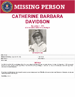 The FBI's Detroit Field Office and Michigan State Police are seeking the public's assistance in locating Catherine Davidson. On September 1, 1973, six-year-old Catherine Davidson was reported missing at Warren Dunes State Park in Sawyer, Michigan. It is believed that her possible death occurred in the Chicago, Illinois, area around the same time period.