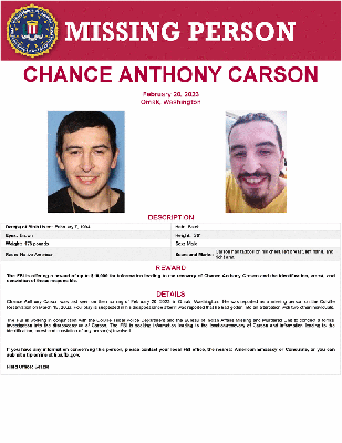 Chance Anthony Carson was last seen on the morning of February 20, 2023, in Omak, Washington. He was reported as a missing person on the Colville Reservation on March 15, 2023. Foul play is suspected in his disappearance after it was reported that he had gotten into an altercation with two other individuals.