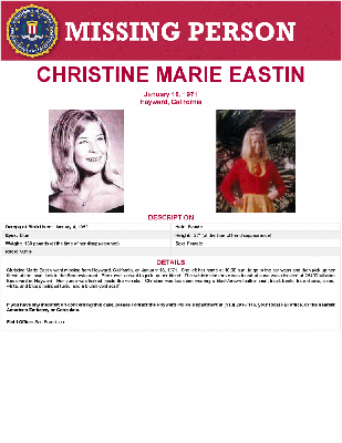 Christine Marie Eastin went missing from Hayward, California, on January 18, 1971. She left her home at 10:00 p.m. to go to the car wash and then pick up her friend at the local Jack in the Box restaurant. She never arrived to pick up her friend. The vehicle she drove was found at a car wash located at 25400 Mission Boulevard in Hayward. Her purse was locked inside the vehicle. Christine was last seen wearing a black/brown leather coat, black boots, blue slacks, a red, white, and blue pinstriped tunic, and a bluish gold scarf.