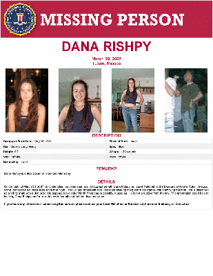 On the night of March 30, 2007, an unidentified man was seen and photographed with Dana Rishpy, an Israeli National, at the Mezzanine Hotel in Tulum, Mexico. Dana Rishpy has not been seen since that night. The FBI and Israeli National Police are seeking the public's assistance with identifying the man. He is described as a White male with a thin build. He appears to be either North American or possibly Australian. He is not a fugitive from the law. This information could help in locating Dana Rishpy and/or provide new information about her disappearance.