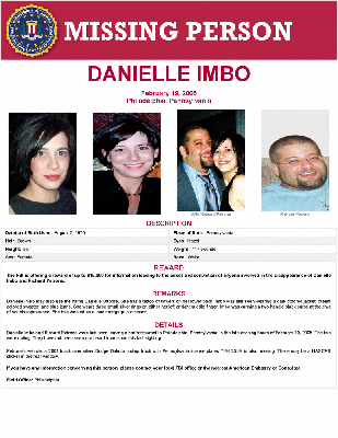 Danielle Imbo and Richard Petrone were last seen leaving a bar/restaurant in Philadelphia, Pennsylvania, in the late evening hours of February 19, 2005. The two were dating. They have not been seen nor heard from since this last sighting.