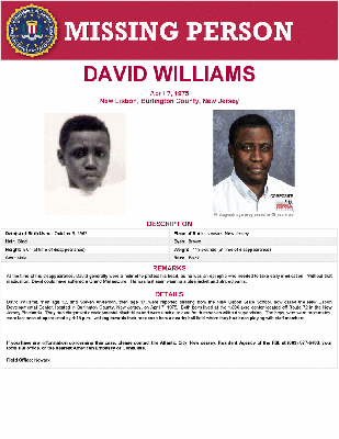 David Williams, then age 12, and Steven Anderson, then age 17, were reported missing from the New Lisbon State School, now called the New Lisbon Developmental Center, located in Burlington County, New Jersey, on April 7, 1975. Both boys lived at the 1,896-acre center located off Route 72 in the New Jersey Pinelands. They had diagnosed developmental disabilities and were unable to care for themselves without supervision. The boys, who were roommates, were last seen at approximately 4:15 p.m., walking towards their residence from a nearby ball field where they had been playing with staff members.