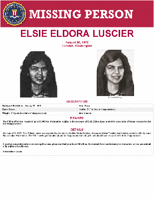 On August 30, 1979, Elsie Eldora Luscier, accompanied by her cousin, Carlotta Maria Sanchez, disappeared from Taholah, Washington, which is in the Quinault Nation Indian Reservation. The FBI is seeking information about the disappearance of both girls, and about those responsible for their disappearance.