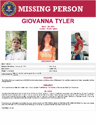 Giovanna Tyler disappeared from her home in the 2000 block of East Gregory St., Tacoma, Washington, under suspicious circumstances. She was 29 years old at the time and the mother of four children. Tyler was married, but had filed for an order of protection against her husband in August of 2003. In April of 2004, Tyler’s parents reported her missing after they had neither seen nor heard from her in approximately two weeks. She has not contacted her family since her disappearance and investigators have been unable to locate her or any persons who have had contact with her.