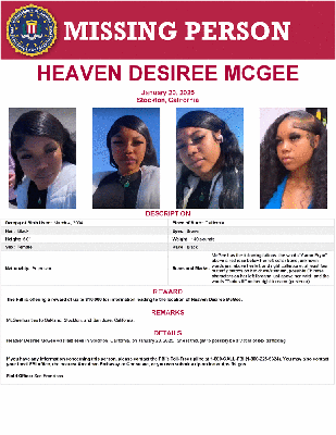 Heather Desiree McGee was last seen in Stockton, California, on January 20, 2025. She is thought to possibly be a victim of sex trafficking.