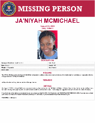 The FBI is offering a reward of up to $10,000 for information leading to the arrest and conviction of the individual, or individuals, responsible for the disappearance of Ja’Niyah McMichael.