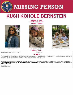 The Federal Bureau of Investigation in Honolulu is seeking information regarding Abigail Bernstein and her two children, Kush Kohole Bernstein and Koa Kai Bernstein. The family was last seen at Ala Wai Boat Harbor in Honolulu, Hawaii, in October of 2022.