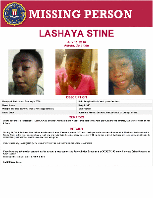 On July 15, 2016, Lashaya Stine left her residence in Aurora, Colorado, around 2:00 a.m. Lashaya was last seen in the area of E. Montview Boulevard and N. Peoria Street in the early morning hours. Lashaya was scheduled for a job interview on July 16th, but never arrived. Lashaya has not made any attempts to contact family members or friends since she has been gone.