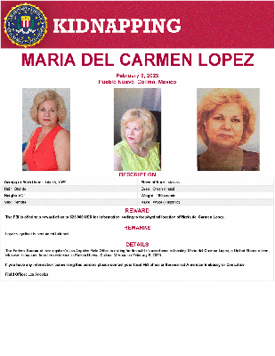 The Federal Bureau of Investigation's Los Angeles Field Office is asking for the public's assistance in locating Maria del Carmen Lopez, a United States citizen, who was kidnapped from her residence in Pueblo Nuevo, Colima, Mexico, on February 9, 2023.