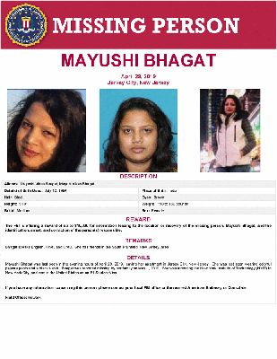 The FBI is offering a reward of up to $10,000 for information leading to the location or recovery of the missing person, Mayushi Bhagat, and the identification, arrest, and conviction of the person(s) responsible.