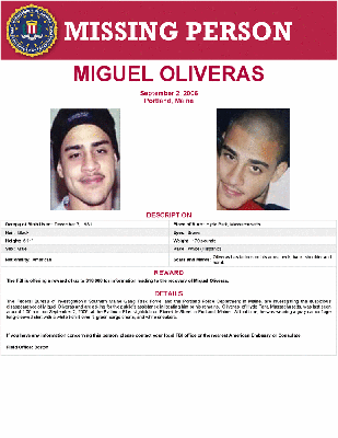 The Federal Bureau of Investigation’s Southern Maine Gang Task Force, and the Portland Police Department in Maine, are investigating the suspicious disappearance of Miguel Oliveras and are asking for the public’s assistance in locating him or his remains. Oliveras, of Hyde Park, Massachusetts, was last seen around 1:00 a.m. on September 2, 2006, at the Platinum Plus Nightclub on Riverside Street in Portland, Maine. At that time, he was wearing a gray camouflage long-sleeved shirt with a white t-shirt over it, green cargo shorts, and white sneakers.