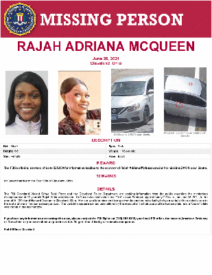 The FBI Cleveland Violent Crime Task Force and the Cleveland Police Department are seeking information from the public regarding the mysterious disappearance of 27-year-old Rajah Adriana McQueen. McQueen was last seen in her 2018 Nissan Sentra at approximately 7:30 a.m., on June 26, 2021, in the area of E. 131st and Harvard Avenue in Cleveland, Ohio. Her car was later observed being driven by another individual with two new bullet hole defects, one in the roof and one in the rear passenger door. The vehicle’s appearance had been altered by the removal of the hubcaps and her license plate, and a “dealer” plate was visible in the rear window.