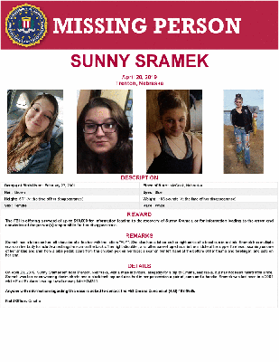 The FBI is offering a reward of up to $10,000 for information leading to the recovery of Sunny Sramek, or for information leading to the arrest and conviction of the person(s) responsible for her disappearance.