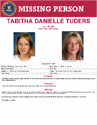 Tabitha Tuders was last seen early on the morning of April 29, 2003, at her residence in Nashville, Tennessee. She left the house on her way to board the school bus, but never got on the bus and did not arrive at school. She has not been seen nor heard from since this time.