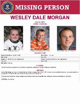 Wesley Dale Morgan has been missing from his home in Clinton, Louisiana, since May 15, 2001. Morgan, who was a toddler at that time, was reportedly last seen playing on the front porch of his home at approximately 9:45 that Tuesday morning.
