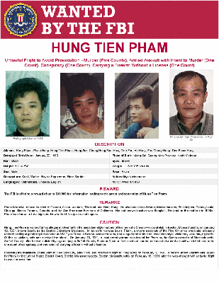 Hung Tien Pham is wanted for his alleged involvement in the execution-style murders of five men at a Chinatown social club in Boston, Massachusetts, on January 12, 1991, known locally as the Boston Chinatown Massacre. In the early morning hours, Pham, a known associate of the Ping On crime syndicate, allegedly entered an illegal gambling den located at 85A Tyler Street in Boston, Massachusetts, and allegedly shot six men, execution-style, while they were playing cards. Of the six victims, only one survived the attack. On January 18, 1991, a local arrest warrant was issued for Pham by the Commonwealth of Massachusetts, Suffolk County, after he was indicted by a grand jury in Suffolk County Superior Court on five counts of murder, one count of armed assault with intent to murder, one count of conspiracy, and one count of carrying a firearm without a license.