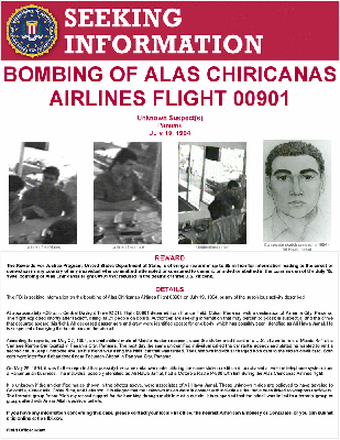 The Rewards For Justice Program, United States Department of State, is offering a reward of up to $5 million for information leading to the arrest or conviction in any country of any individual who committed, attempted or conspired to commit, or aided or abetted in the commission of the July 19, 1994, bombing of Alas Chiricanas Flight 00901 that resulted in the deaths of three U.S. citizens.