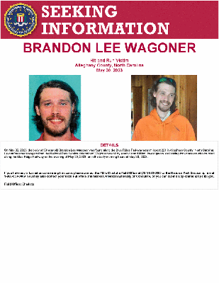 On May 30, 2023, the body of 33-year-old Brandon Lee Wagoner was found along the Blue Ridge Parkway near milepost 221 in Alleghany County, North Carolina. Law enforcement rangers from the National Park Service determined Wagoner was hit by a vehicle and killed. Investigators are looking for witnesses who traveled along the Blue Ridge Parkway on the evening of May 29, 2023, or in the early morning hours of May 30, 2023.
