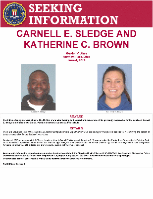 The FBI is offering a reward of up to $25,000 for information leading to the arrest and conviction of the person(s) responsible for the deaths of Carnell E. Sledge and Katherine C. Brown. Additional reward money may be available.