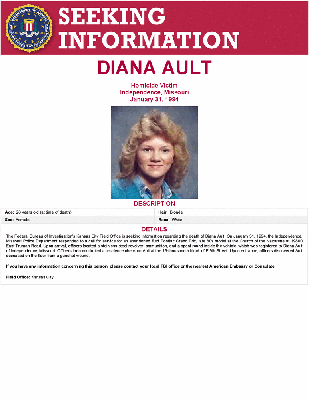The Federal Bureau of Investigation's Kansas City Field Office is seeking information regarding the death of Diana Ault. On January 31, 1994, the Independence, Missouri Police Department responded to a call for service for an abandoned Red Pontiac Grand Prix, late 80s model at the Church of the Nazarene at 19800 East Truman Road. Upon arrival, officers located a stainless-steel revolver, ammunition, and a spent round inside the vehicle, which was registered to Diana Ault of Independence, Missouri. Officers then conducted a residence check on Ault at the 19-thousandth block of E 9th Street. Upon entrance, officers discovered Ault deceased on the floor from a gunshot wound.