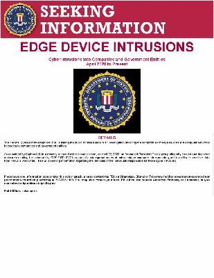 The Federal Bureau of Investigation (FBI) is asking the public for assistance in an investigation involving the compromise of edge devices and computer networks belonging to companies and government entities.