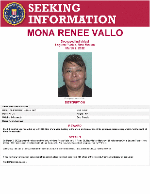 The FBI is offering a reward of up to $10,000 for information leading to the arrest and conviction of the person or persons responsible for the death of Mona Renee Vallo.