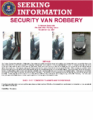 The Federal Bureau of Investigation in Philadelphia, Pennsylvania, is seeking information regarding the robbery of a Gardaworld security van and its driver at the Rite-Aid located at 5214 Baltimore Avenue in Philadelphia, Pennsylvania. On November 22, 2024, at approximately 07:24 a.m., a Gardaworld security van and its driver were robbed while the driver went to pick up a cash drop. Shortly after the van arrived, a dark-colored Buick Enclave arrived and parked on the passenger side of the security van. One suspect, wearing an Amazon vest and a ski mask, exited the vehicle and opened the trunk. When the security van driver exited the store and got back to the vehicle, the suspect standing at the trunk attacked the driver with a baton-style weapon. During the assault, the driver of the Buick Enclave, wearing all black clothing and a backwards hat, exited the vehicle and assaulted the security van driver with brass knuckles. A third suspect climbed into the driver seat of the Buick Enclave and backed the car out of the space. The suspect with the backwards hat took the security driver’s pistol and got back into the Buick. The first suspect, with the Amazon vest, continued to assault the driver with the baton before taking the bag with the Rite-Aid money. The first suspect then got back into the Buick before all three suspects sped out of the parking lot in the Buick Enclave.