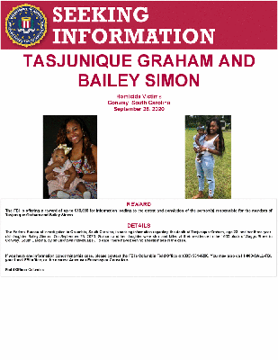 The Federal Bureau of Investigation in Columbia, South Carolina, is seeking information regarding the death of Tasjunique Graham, age 23, and her three-year-old daughter Bailey Simon. On September 28, 2020, Graham and her daughter were shot and killed at their residence in the 1600 block of Suggs Street in Conway, South Carolina, by an unknown individual(s). To date, there have been no arrests made in the case.