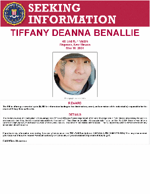 The Federal Bureau of Investigation’s Albuquerque Field Office and Navajo Nation Department of Criminal Investigations in New Mexico are seeking the public's assistance in identifying the individual(s) responsible for the death of Tiffany Deanna Benallie. At approximately 1 a.m., on May 18, 2024, Benallie was hit by a vehicle on Highway 491, mile marker 95, near Shiprock, New Mexico. The driver of the vehicle left the scene. The FBI urges the public to come forward with any information about this crime.