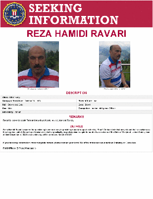 Reza Hamidi Ravari is wanted for questioning in connection with providing material support to the Naji Sharifi Zindashti criminal network and their associates as they targeted United States-based Iranian dissidents, specifically his participation in a plot to murder two residents of the State of Maryland, United States, from at least December of 2020, and continuing until in or around March of 2021.