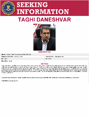 Taghi Daneshvar, an official of Iran’s Ministry of Intelligence and Security (MOIS), is wanted for questioning based on his alleged involvement in the abduction, detention, and probable death of retired FBI Special Agent Robert A. Levinson, as well as Iran’s alleged efforts to cover up its responsibility. Levinson travelled to Kish Island, Iran, on March 8, 2007, and has not been publicly seen or heard from since his disappearance the following day. In 2010 and 2011, a video and photographs were obtained showing Levinson in captivity. In March of 2025, the United States Department of the Treasury designated Daneshvar and others for their involvement in Levinson’s abduction, detention, and probable death. The FBI continues its investigation in order to identify more Iranian officials involved in Levinson’s abduction.