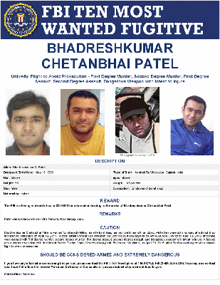 The FBI is offering a reward of up to $250,000 for information leading to the arrest of Bhadreshkumar Chetanbhai Patel.