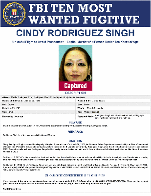 Cindy Rodriguez Singh is wanted for allegedly killing her 6-year-old son. On March 20, 2023, the Everman Police Department was asked by the Texas Department of Family and Protective Services to conduct a welfare check on the 6-year-old son of Cindy Rodriguez Singh, after the child had not been seen since October 2022. During the welfare check, Rodriguez Singh lied to investigators and indicated that the child was in Mexico with his biological father and had been there since November 2022.