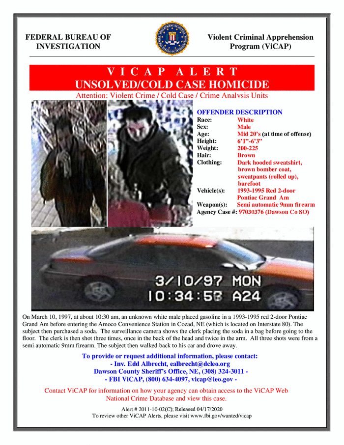 On March 10, 1997, at about 10:30 am, an unknown white male placed gasoline in a 1993-1995 red 2-door Pontiac Grand Am before entering the Amoco Convenience Station in Cozad, NE (which is located on Interstate 80). The subject then purchased a soda. The surveillance camera shows the clerk placing the soda in a bag before going to the floor. The clerk is then shot three times, once in the back of the head and twice in the arm. All three shots were from a semi automatic 9mm firearm. The subject then walked back to his car and drove away.