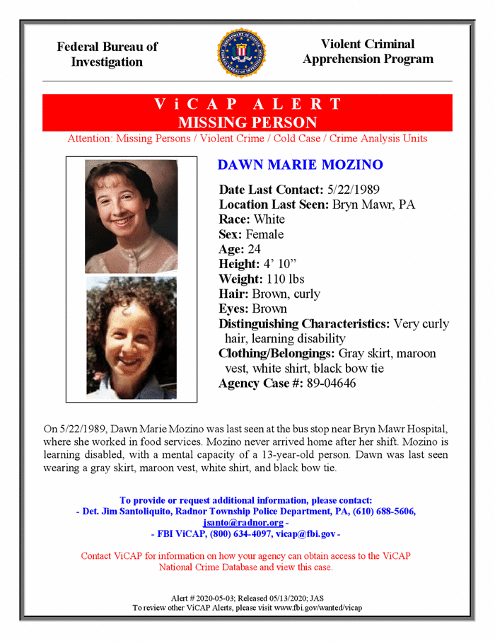 On May 22, 1989, Dawn Marie Mozino was last seen at the bus stop near Bryn Mawr Hospital, where she worked in food services. Mozino never arrived home after her shift. Mozino is learning disabled, with a mental capacity of a 13-year-old person. She was last seen wearing a gray skirt, maroon vest, white shirt, and black bow tie.
