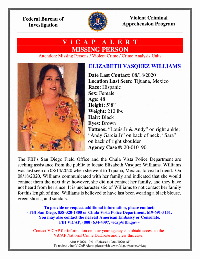 The FBI’s San Diego Field Office and the Chula Vista Police Department are seeking assistance from the public to locate Elizabeth Vasquez Williams. Williams was last seen on August 14, 2020, when she went to Tijuana, Mexico, to visit a friend. On August 18, 2020, Williams communicated with her family and indicated that she would contact them the next day; however, she did not contact her family, and they have not heard from her since. It is uncharacteristic of Williams to not contact her family for this length of time. Williams is believed to have last been wearing a black blouse, green shorts, and sandals.