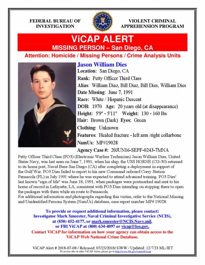Petty Officer Third Class (PO3) (Electronic Warfare Technician) Jason William Dies, United States Navy, was last seen on June 7, 1991, when his ship, the USS HORNE (CG-30) returned to its home port, Naval Base San Diego, California, after completing a deployment in support of the Gulf War. PO3 Dies failed to report to his new Command onboard Corry Station Pensacola, Florida, in July 1991, where he was expected to attend advanced training. PO3 Dies' last known "sign of life" was June 18, 1991, when packages were postmarked and sent to his home of record in Lafayette, Louisiana, consistent with PO3 Dies intending on stopping there to open the packages with them while en route to Pensacola.