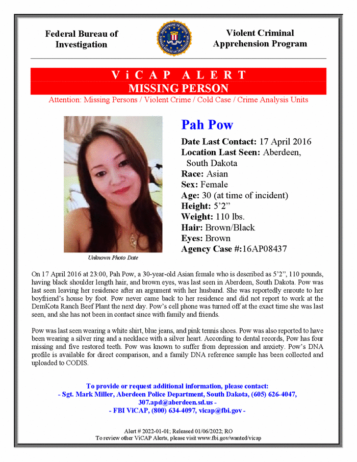 On April 17, 2016, at 11:00 p.m., Pah Pow, a 30-year-old Asian female who is described as 5’2”, 110 pounds, having black shoulder length hair and brown eyes, was last seen in Aberdeen, South Dakota. Pow was last seen leaving her residence after an argument with her husband. She was reportedly enroute to her boyfriend’s house by foot. Pow never came back to her residence and did not report to work at the DemKota Ranch Beef Plant the next day. Pow’s cell phone was turned off at the exact time she was last seen, and she has not been in contact since with family and friends.