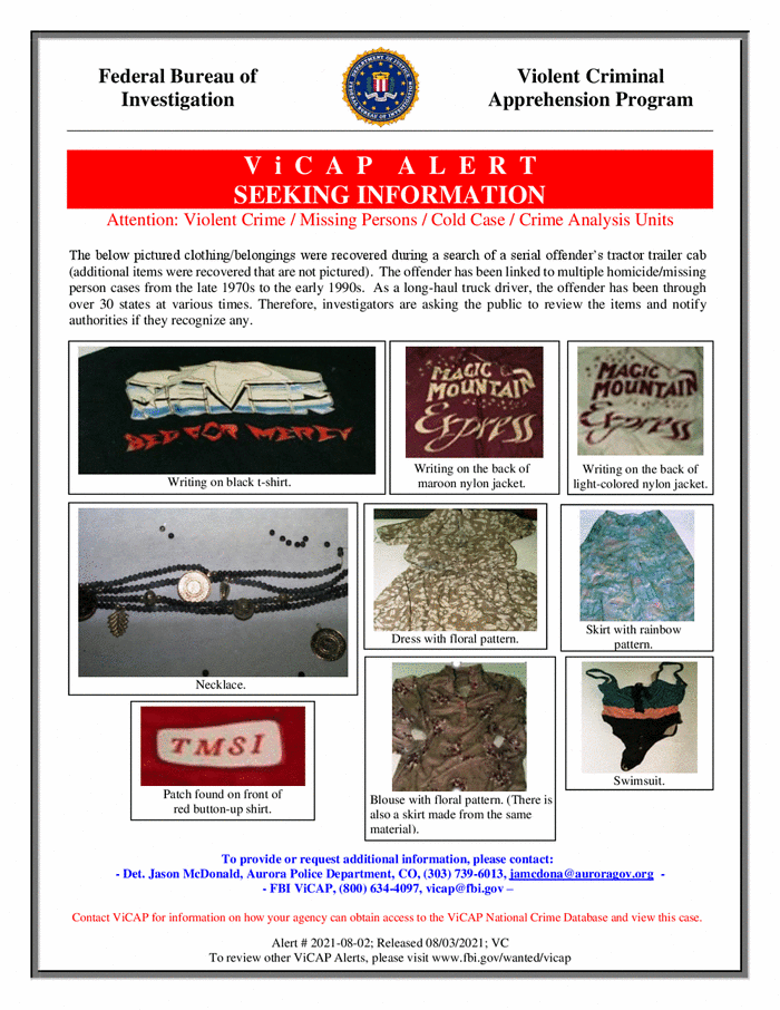 The pictured clothing/belongings were recovered during a search of a serial offender’s tractor trailer cab (additional items were recovered that are not pictured). The offender has been linked to multiple homicide/missing person cases from the late 1970s to the early 1990s. As a long-haul truck driver, the offender has been through over 30 states at various times. Therefore, investigators are asking the public to review the items and notify authorities if they recognize any.