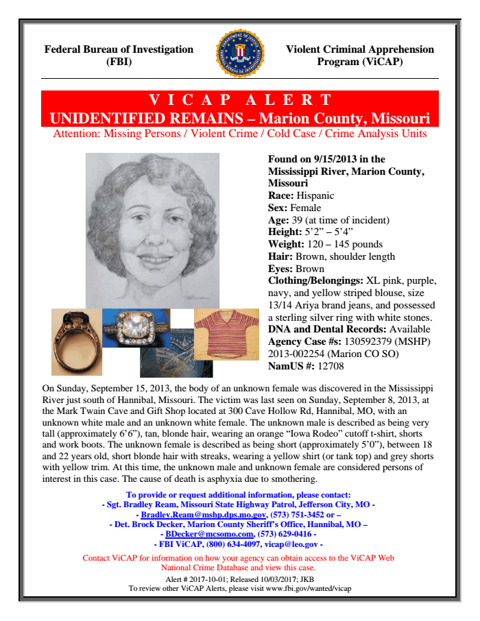 On Sunday, September 15, 2013, the body of an unknown female was discovered in the Mississippi River just south of Hannibal, Missouri. The victim was last seen on Sunday, September 8, 2013, at the Mark Twain Cave and Gift Shop located at 300 Cave Hollow Rd, Hannibal, Missouri, with an unknown white male and an unknown white female. The unknown male is described as being very tall (approximately 6’6”), tan, blond hair, wearing an orange “Iowa Rodeo” cutoff t-shirt, shorts and work boots. The unknown female is described as being short (approximately 5’0”), between 18 and 22 years old, short blonde hair with streaks, wearing a yellow shirt (or tank top) and grey shorts with yellow trim. At this time, the unknown male and unknown female are considered persons of interest in this case. The cause of death is asphyxia due to smothering.