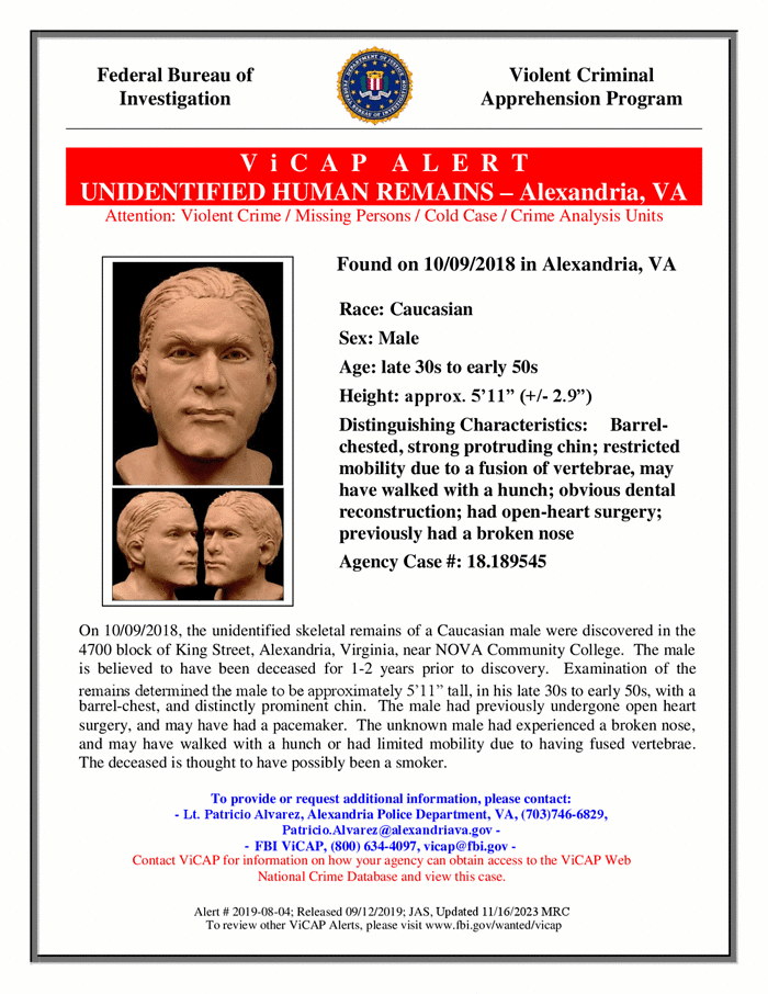On October 9, 2018, the unidentified skeletal remains of a Caucasian male were discovered in the 4700 block of King Street, Alexandria, Virginia, near NOVA Community College. The male is believed to have been deceased for 1-2 years prior to discovery. Examination of the remains determined the male to be approximately 5’11" tall, in his late 30s to early 50s, with a barrel-chest, and distinctly prominent chin. The male had previously undergone open heart surgery, and may have had a pacemaker. The unknown male had experienced a broken nose, and may have walked with a hunch or had limited mobility due to having fused vertebrae. The deceased is thought to have possibly been a smoker.