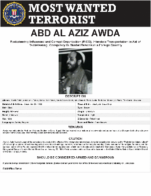 Abd Al Aziz Awda is wanted for conspiracy to conduct the affairs of the designated international terrorist organization known as the "Palestinian Islamic Jihad" (PIJ) through a pattern of racketeering activities such as bombings, murders, extortions, and money laundering. Awda was one of the original founders and the spiritual leader of the PIJ and is presently still involved in the organization, which has its headquarters located in Damascus, Syria. He was listed as a "Specially Designated Terrorist" under United States law on January 23, 1995. Awda was indicted in a 53 count indictment in the United States District Court, Middle District of Florida, Tampa, Florida.